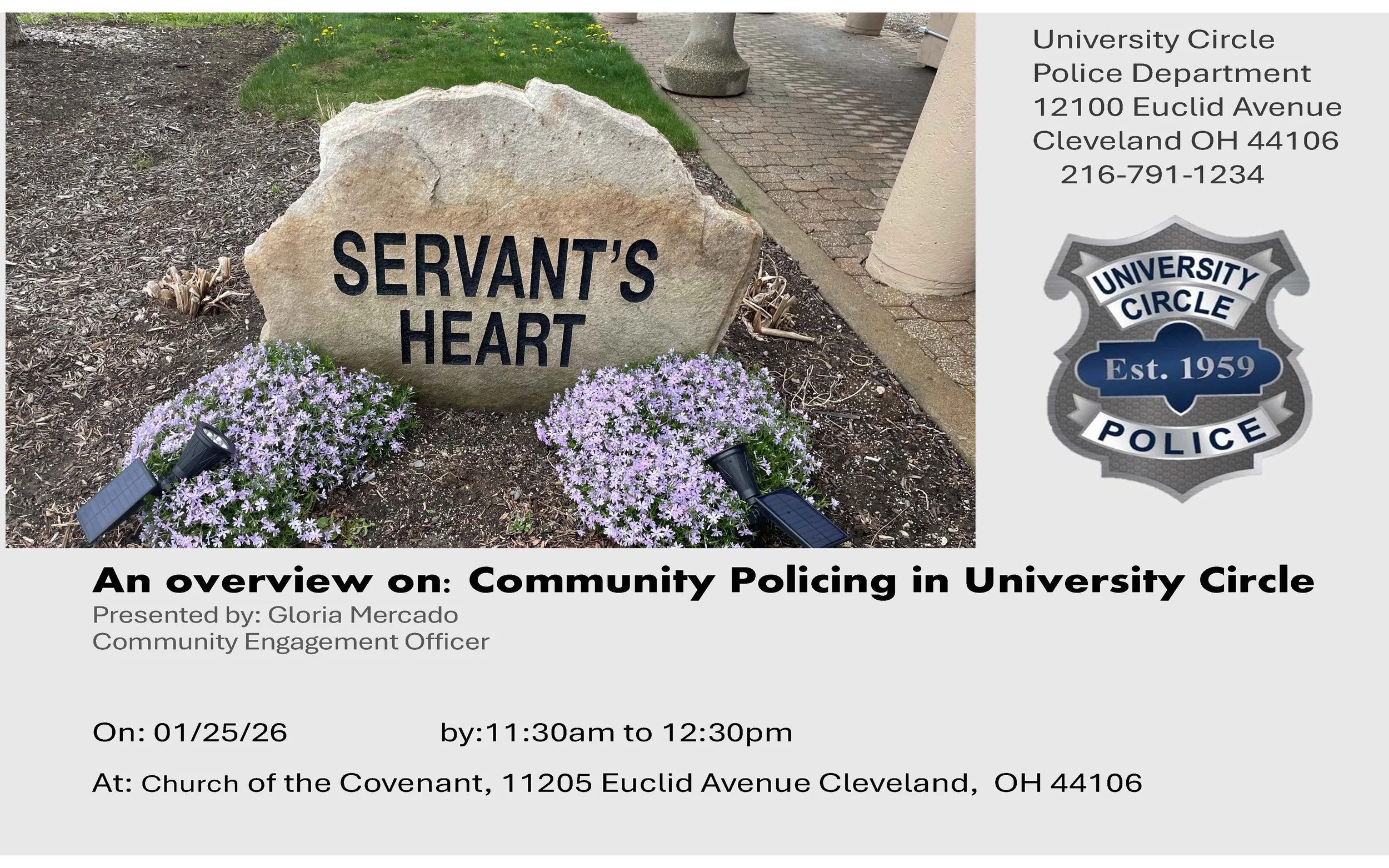 11:30 a.m. - 12:30 p.m.Learn how community policing in University Circle reflects a commitment to trust, compassion, and servant leadership, as Gloria Mercado, Community Engagement Officer, shares how police serve and care for their neighbors.